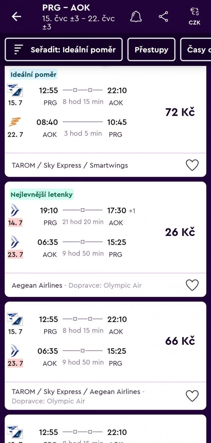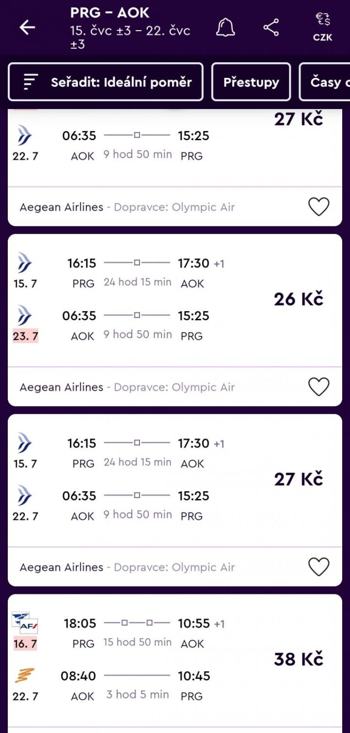 @Jan Vidim: v rámci objektivity - kde jsi pořídil ty screenshoty? Ani Aegean ani Olympic v tom termínu lety PRG-AOK neprovozují, na eDreams se mi to taky nepodařilo najit...?
