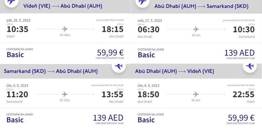 Wizz skládačka na levný Uzbekistán, směr tam se dá vyměnit za Taškent. Výhoda je, že nejsou nutný noclehy v SAE, snad jen ta cesta tam se musí nějak přečkat na letišti nebo v obchoďáku Yas Mall.