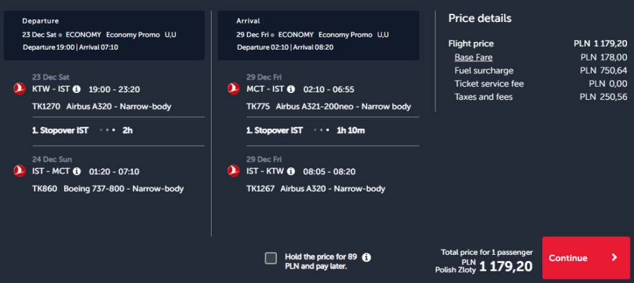 Jestli už chcete mít na příští Vánoce jasný program, možná by se mohly hodit letenky s TK někde do Emirátů, Kataru, Ománu apod. Lze to různě kombinovat jako open-jaw, ale návrat po Novém roce bohužel za jinou cenu. Dá se samozřejmě očekávat, že mohou nastat nějaké změny v letovém řádu = zdarma změna na vhodnější termín.