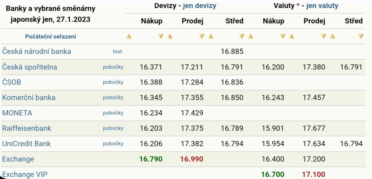 Dost nevýhodné. Včera měla KB kurz valuta prodej 100 JPY za 17,71 CZK, Exchange.cz za valuta prodej 17,20 CZK.