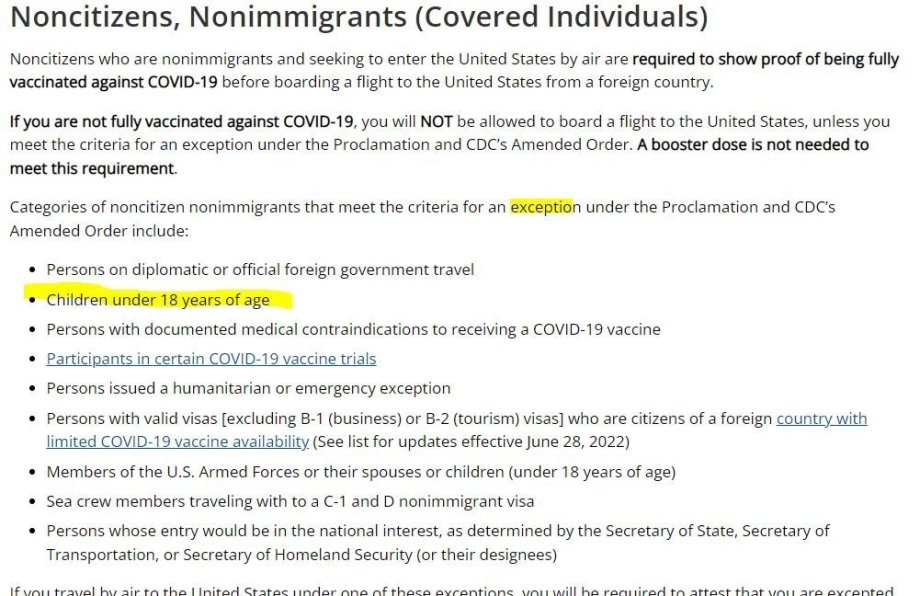 Přímo na stránkách CDC jsou děti pod 18 uvedeny ve vyjímkách z očkováni. Ale mohou pak po detech chtit, aby se par dnu po priletu do USA dosly otestovat