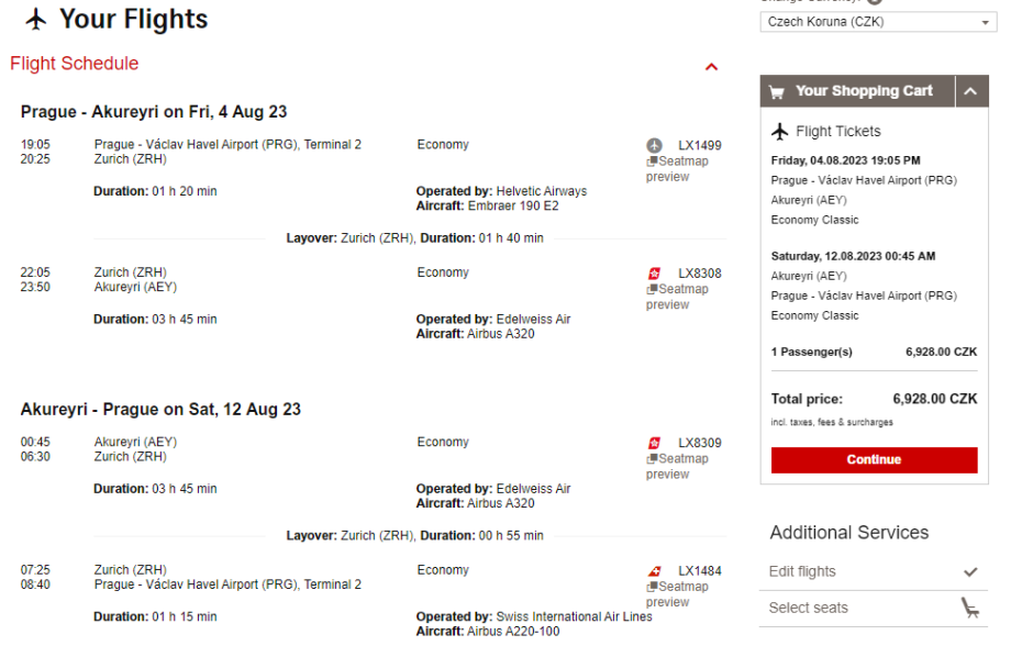 [LX] Praha - Akureyri 6.928 Kč / 23 kg / free seat