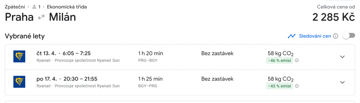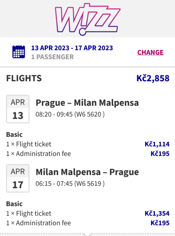 odlet 13.4. Praha - Malpensa (Milán) - ráno přílet 17.4. - Malpensa - Praha - ráno WizzAir, bez přepisu, 20kg zavazadlo odbavené a 10kg příruční v ceně 3tis za kus .