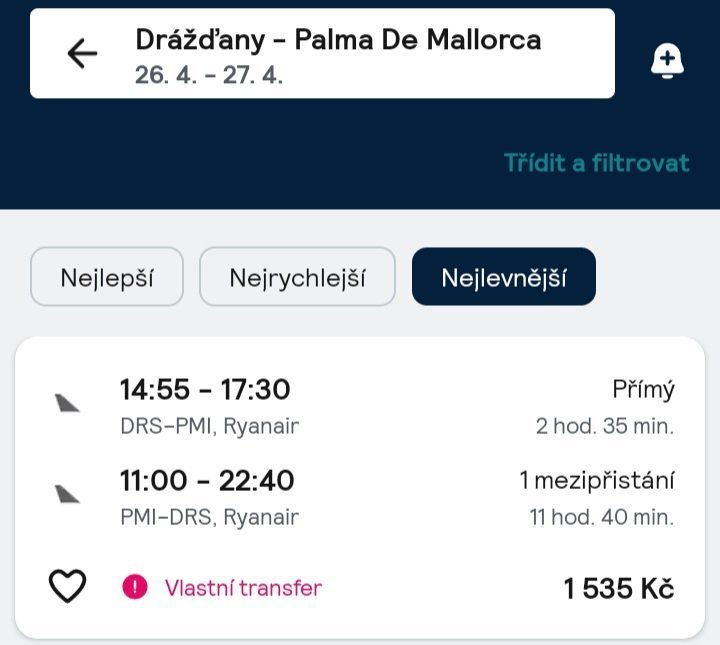 CestovatelX napsal(a):Tahle rychlocestička z Drážďan na Mallorcu mi vychází přes TRIP.com > FR, FR, Eur ....na rovných 50€. Návrat přes STN.....