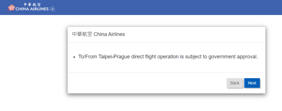 Ahoj, nevíte někdo něco ohledně přímého letu Praha - Taipei? Když jsme kupovali letenky (ještě před tím čínským cvičením u Tchajwanu), tak tam nic o tom, že je ještě v procesu schválení vládou nic nepsali.. Teď to vypadá, že to není 100%. V Manage bookingu nic není, tváří se to jako že to platí, ale otázka jestli plánovat další přelety.. Nemáte někdo info?