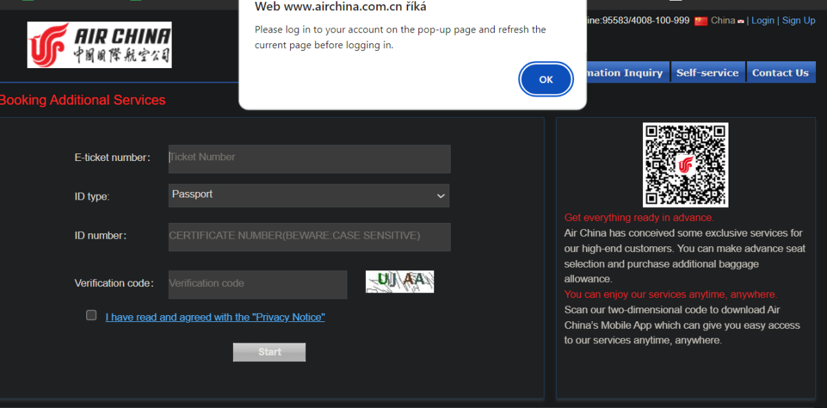 Podařilo se někomu požádat online o ten free transit hotel? Když to na téhle stránce zkouším https://www.airchina.com.cn/vase...service=th, tak po kliknutí na "E-ticket number" vyskočí okno, že se musím registrovat. To mi ale přes naše telefonní číslo nejde