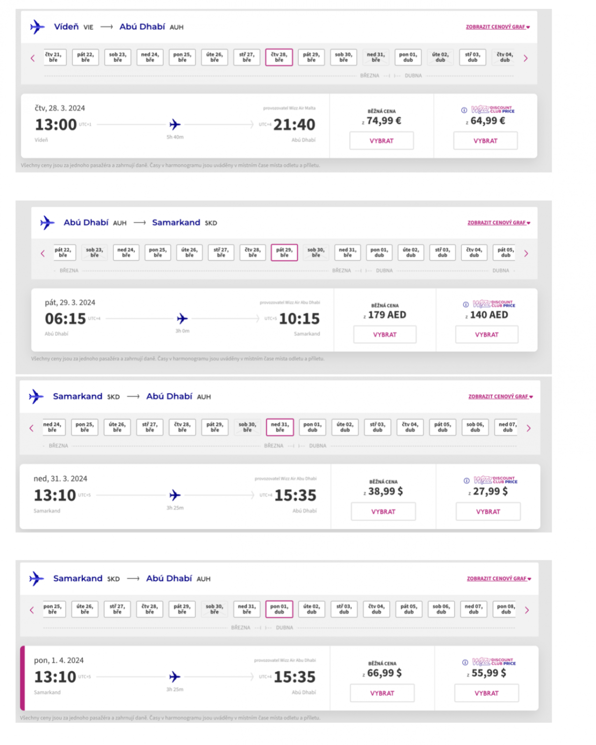 Ahojte hladam nejakú lacnú letenku niekam ideálne mimo EU na predlžený víkend ktorý bude od 28.3 do 2.4 dátumy sú dané prípadne 27.3 alebo 3.4 návrat by ešte šiel. Ideálne tak 5-7tis kč spiatočka Zatial som našiel takéto niečo ale problém je s návratom z AUH, jediné lacné letenky sú cez TLV a to je teraz asi riziko. mám wizzair klub Dik za pomoc .