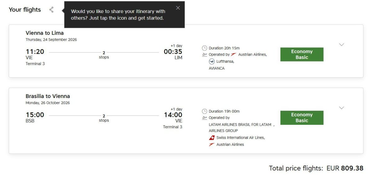 Osobně bych řekl, že fajn cena s odbaveným zavazadlem je 20 tisíc a méně. První jsem vyzkoušel Star Alliance Austrian a je zde částka 809 EUR. Což už je, alespoň pro mě, na hranici slušné ceny. Zvlášť s nějakým nastaveným termínem. A taky odbaveným zavazadlem.
