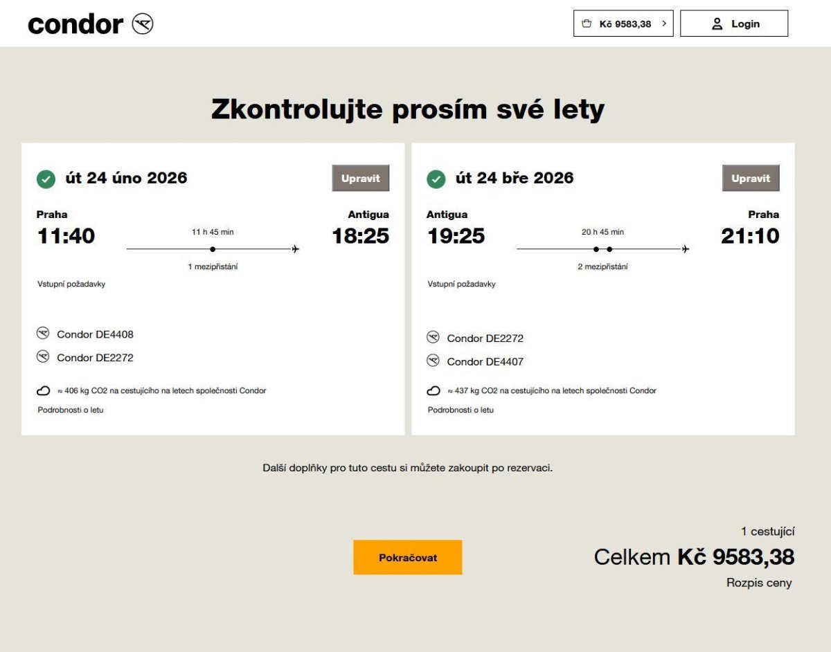 Skvělé ceny z Prahy nabízí Condor na Antiguu a Barbudu  na následující měsíce. Nejlevnější je měsíční termín od 24. února do 24. března. Od 9 583 Kč , ALE dvoutýdenní pobyty jsou dostání jen o 500 Kč dráž, což už je přijatelná doba, pro většinu zaměstnaných.
