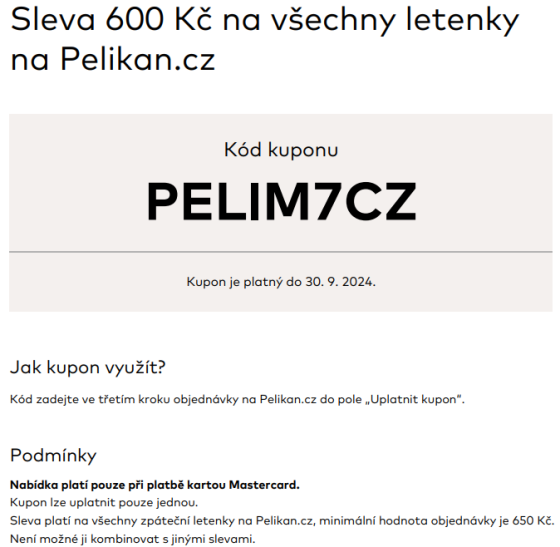 Na Pelikánovi opět funguje kód PEL600CZ i pro ow lety.
