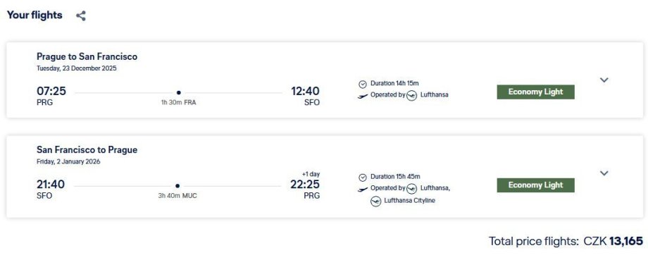 Letenka Praha – San Francisco s Lufthansou, 23. 12. – 2. 1.