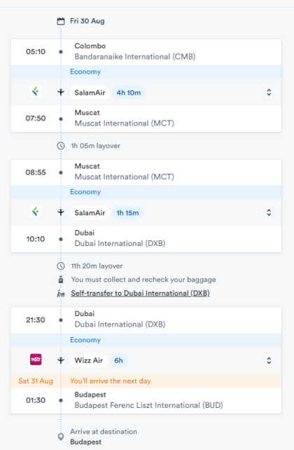 - CMB-MCT-DXB (SalamAir), DXB-Wizz (Wizz)