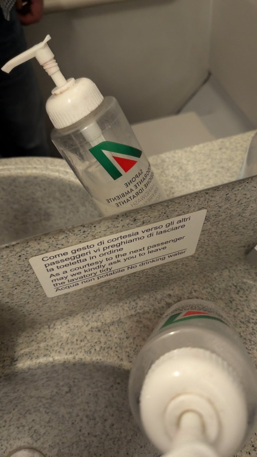 • letadlo je stare, ale ok - je vtipne, ze jak to maji po alitalii, tak stitky jsou v italstine a napriklad mydlo na zachode se nemenilo, stejne tak sedacky s italskou trikolorou