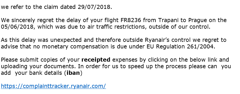 Zrovna jsem dosta odpvoed od Ryanairu ohldne naseho sestihodinove pobytu na letisti v Trapani, kde bylo v te dobe absolutne vse - az a jedno prakticky vyprodane bistro - zavrene. V letadle hlasili pri odletu,z e jim do motoru vletel ptak, ten pisou, ze slo o "air traffic restrcition"mimo jejich kontrolu. Na tom letisti nebyl tou dobou zadny provoz, pocasi naprosto v poradku a osobne jsem videl priletat mensi tryskac, z nejz vystoupilo nekolik lidi v kombinezach RyanAir a neco na letadle opravovali. Hraju o 9 cestujicich, tedy 9x 250EUR a tak se mi nechce nechavat provizi nejake agenture :)