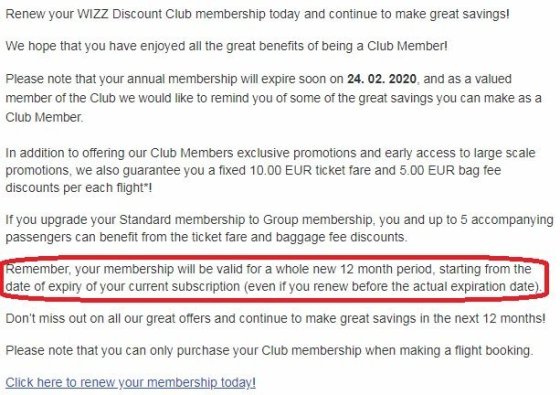 "Bez ohledu na zrušení vašeho letu, poplatek za členství WIZZ Discount Club je nevratný, ale členství zůstává platné po dobu jednoho roku. Při příští rezervaci letu s Wizz Air nezapomeňte využít výhod svého členství."