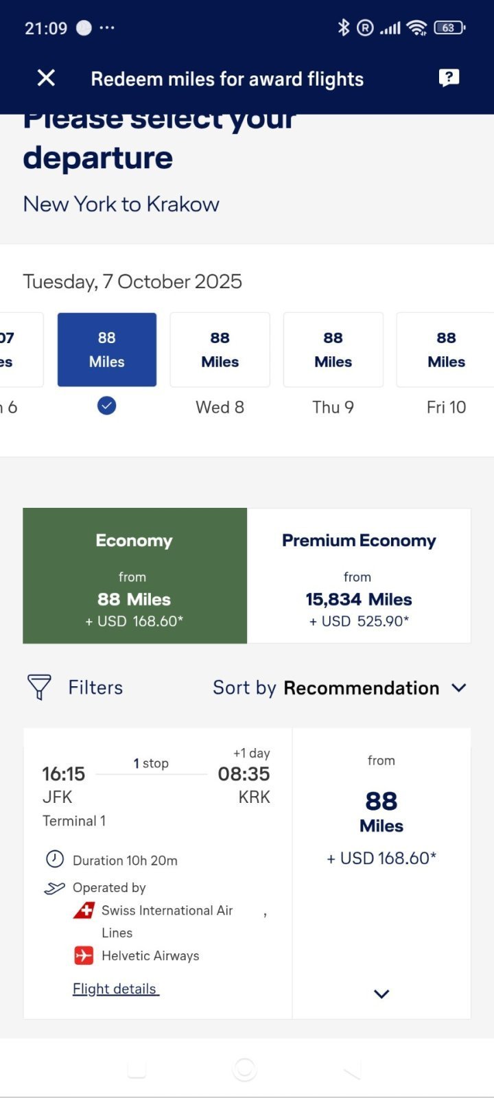 Moje první award letenky s M&M, protože nám zkolabovalo auto v Chorvatsku. Manželku a dítě (4Y) jsem poslal z PUY-ZRH-PRG, v eco light, za 104€ (taxy celkem) + 3.762M + 2.821M. Koupeno 1 den před odletem. Standardní cena 336€/ osoba. Eco mělo pro nás cenu First class :-)