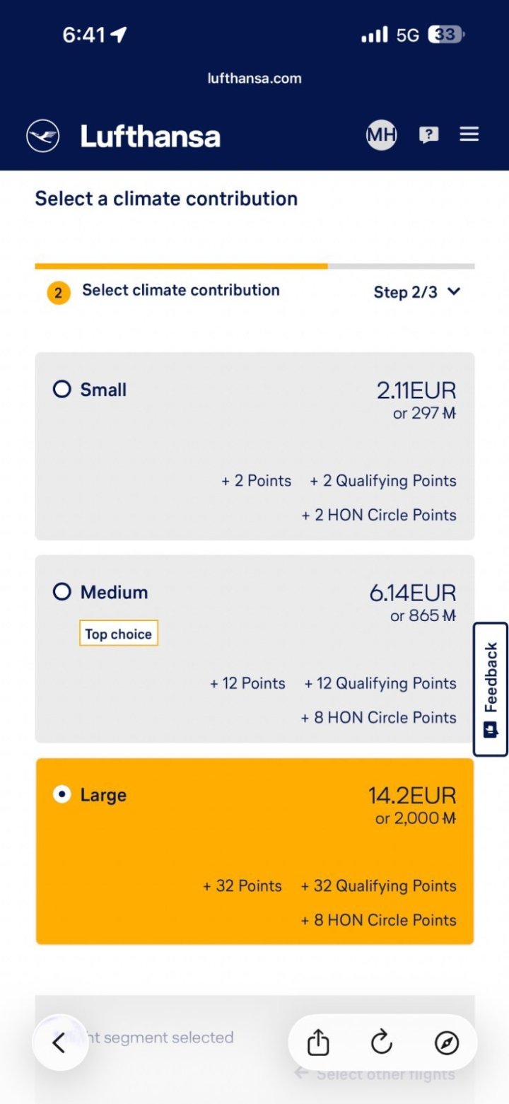 prosim mate zkusenost s akci LH? Bylo prislibeno pri zapojeni se do “climate contribution” pri vyberu balicku “Large” per segment +32 points, +32 qualifying points, 8 Hon (viz obrazek). Po platbe, jsem ale obdrzel mene, nebo nic. Vidina statusu FF, mi ted jenom zpusobila komplikace :-/