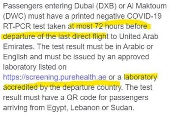 První zvýrazněná část, dejme tomu, že se jedná jen o technikálii, že pokud je víc letů, musí být nejméně 72 hodin před letem do Dubaje.