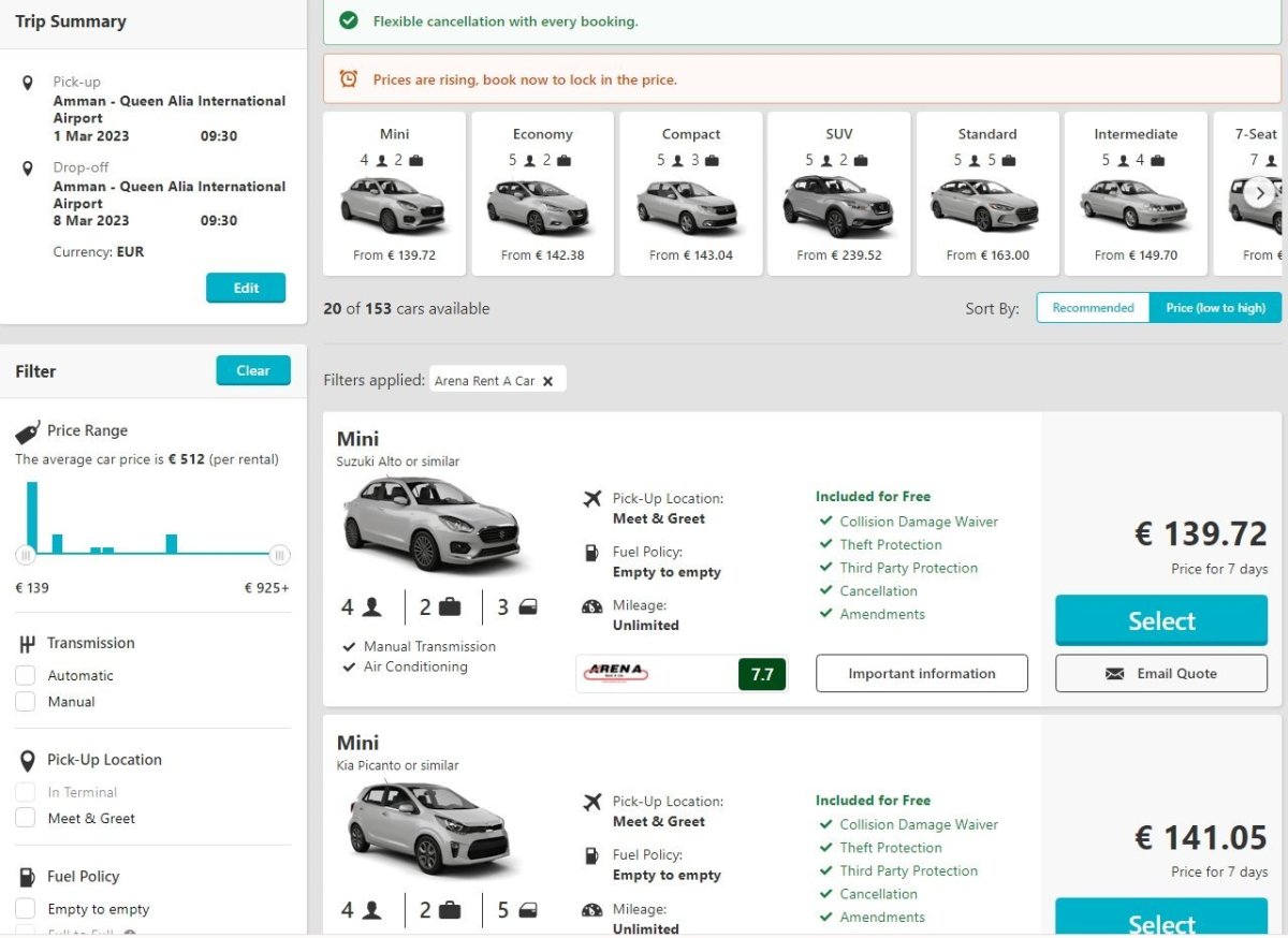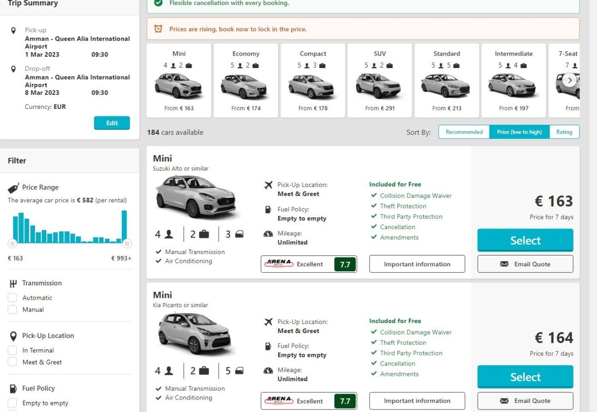 Viď v prílohe, v rovnakom čase vyhľadané požičanie auta na letisku v Ammáne, v rovnakých termínoch, raz priamo cez holidayautos a raz cez skyscanner a následný preklik na holidayautos.