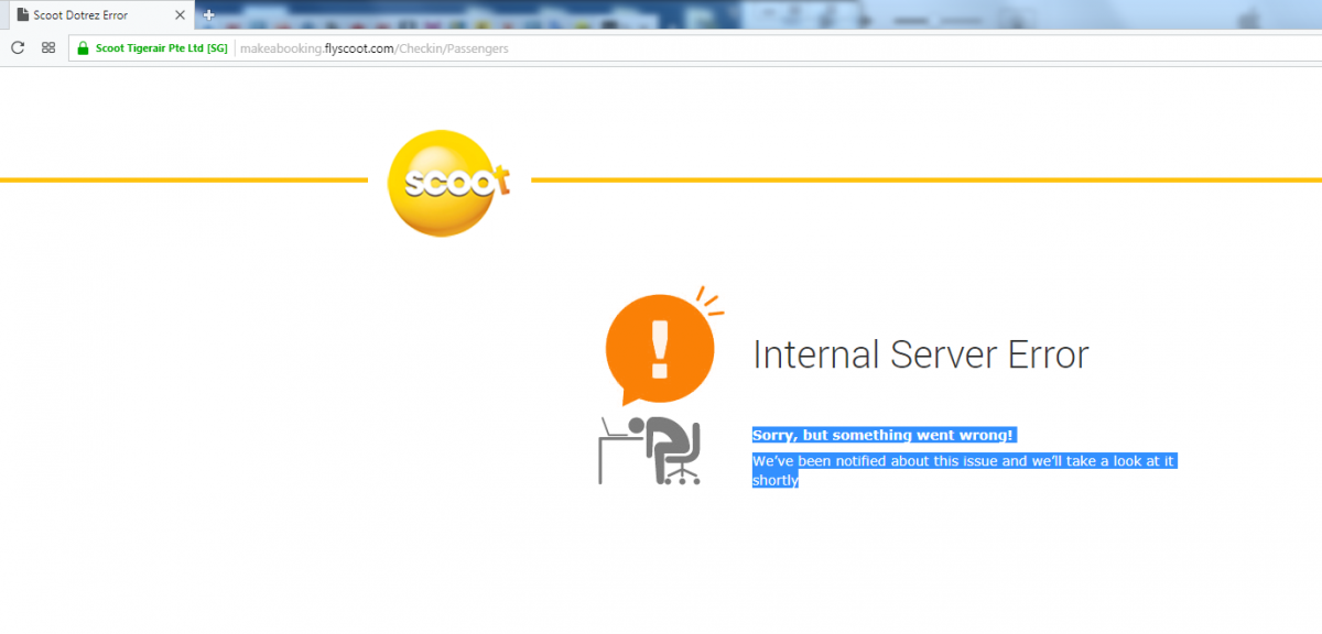 letíme se Scootem v neděli 4.11. Berlín-Singapur-Bali, snažil jsem se udělat on-line check-in jak píšou, že by mělo jít 72 hod dopředu - vyplním Bookig Reference, Surname, Departing, vidím bod 1. DETAILS, kliknu na Continue, pustí mně to do bodu 2. ITINERARY, kde zase kliknu na Continue, ale do bodu 3. PASSENGERS se bohužel už nedostanu :( Píše mně to hlášku Internal Server Error -Sorry, but something went wrong! We’ve been notified about this issue and we’ll take a look at it shortly.