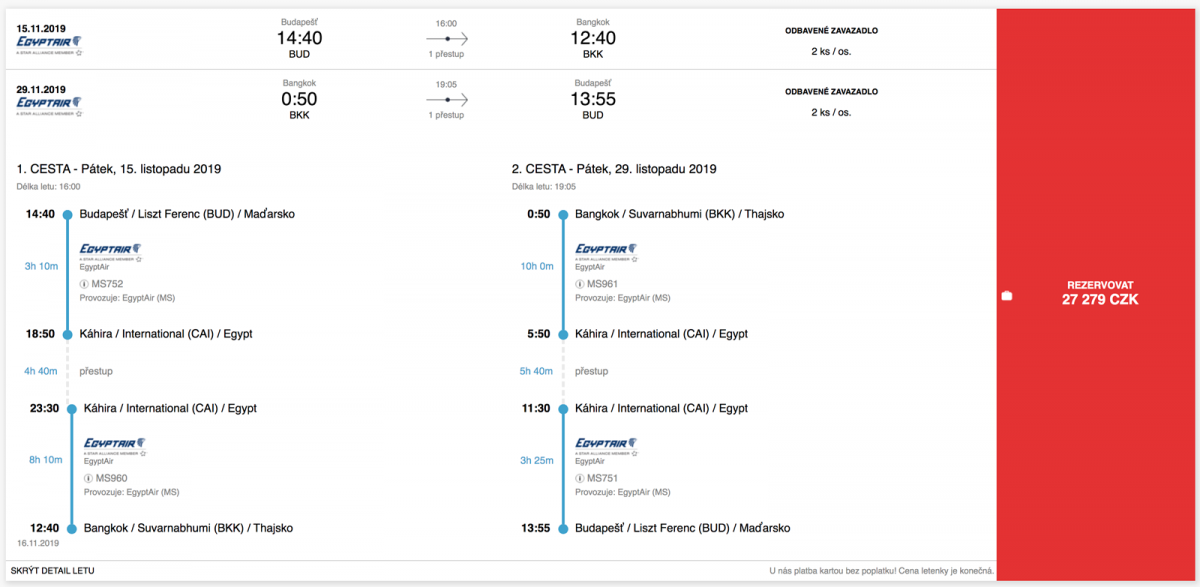 Budapešť – Bangkok s Egyptair za 27 279 Kč. Letí A220 a A330