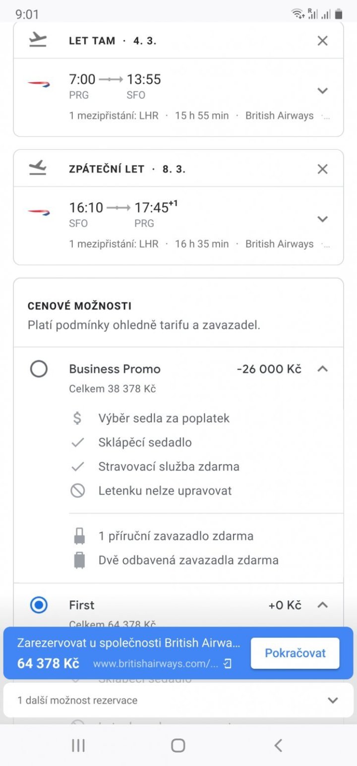 BA PRG-USA First class sale, napr. SFO za 64k. Byznys za necelych 40k. Jestli to pujde proletet je otazka, A380 jiz vyrazene,byt google flights stale ukazuje ze poletite a380. Bookovat lze primo na BA.