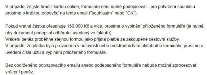 “až nám LATAM vrátí peníze. Toto obvykle trvá 1-4týdny, při současné situaci může vyřízení refundu trvat i několik měsíců (dle dopravce do 60ti dnů). Následně Vám automaticky zašleme formulář na vrácení peněz k potvrzení bankovního spojení a po jeho akceptaci a uplynutí doby splatnosti Vám zašleme peníze zpět na účet.“