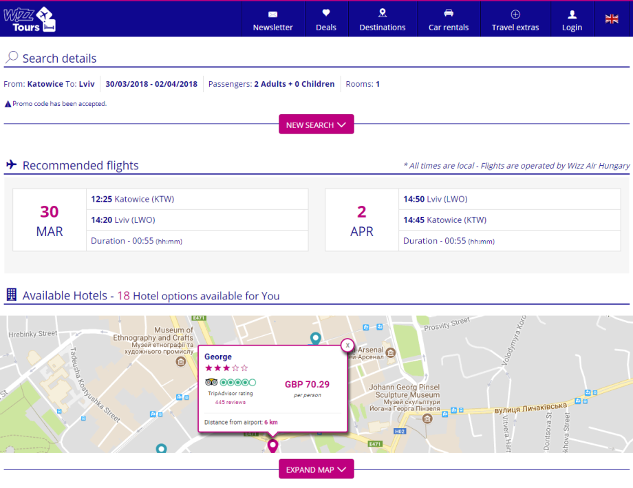 Třeba na Velikonoce se dá udělat po slevě letenka z Katovic s hotelem se snídaní v centru Lvova za cca 70 GBP/2010 CZK/osoba. Samotný hotel na uvedená data stojí skoro stejně jako celý balíček od Wizz Tours.