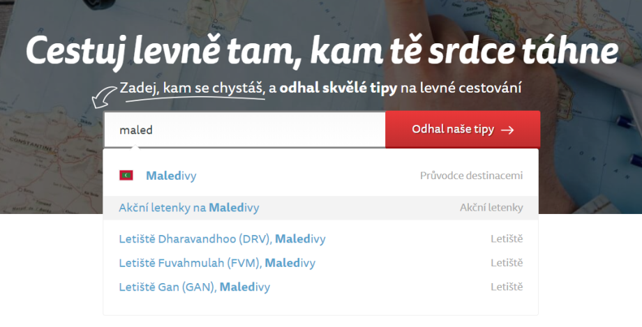 tonic napsal(a):Tonic, toto jsi radil už včera nebo předevčírem, tuším se jednalo o Malajsii... byl jsem překvapen, že taková možnost filtrování na CL existuje, zkusil jsem a nefungovalo mi to ani minule, ani teď. Když do toho vyhledávacího pole napíši Maledivy (nebo Malajsie, na stránce akční letenky), tak mi to nevyfiltruje nebo neudělá vůbec nic - stále tam vidím ty stejné dlaždice se všemi akcemi od poslední dozadu. Jediné, co mohu udělat, je vybrat kontinent, pak mi to vyfiltruje akce v daném světadíle. Ale konkrétní jednu zemi ne. Tak nevím, kde je chyba. A možná to nefunguje ani ostatním.https://www.cestujlevne.com/akcni-letenky