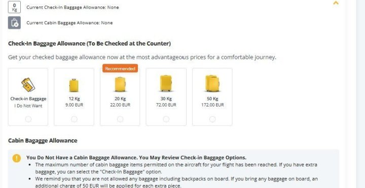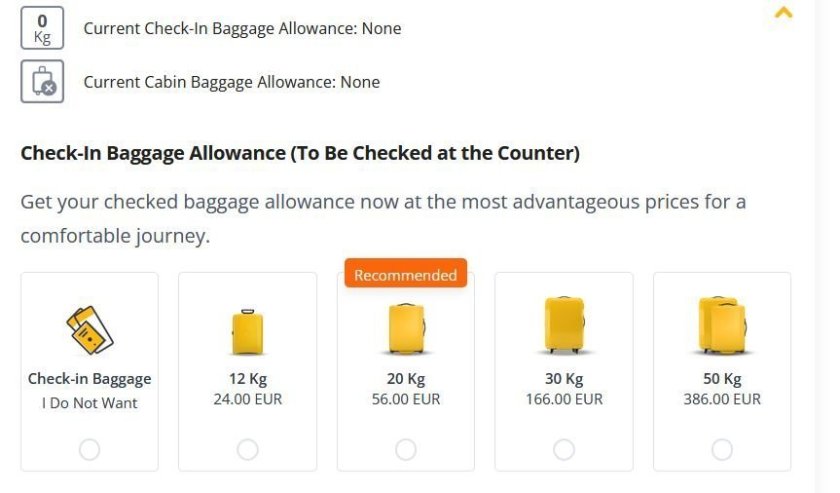 Guests travelling with the Light Package can purchase cabin baggage allowance at the time of ticketing for €9 and check-in baggage for €9.