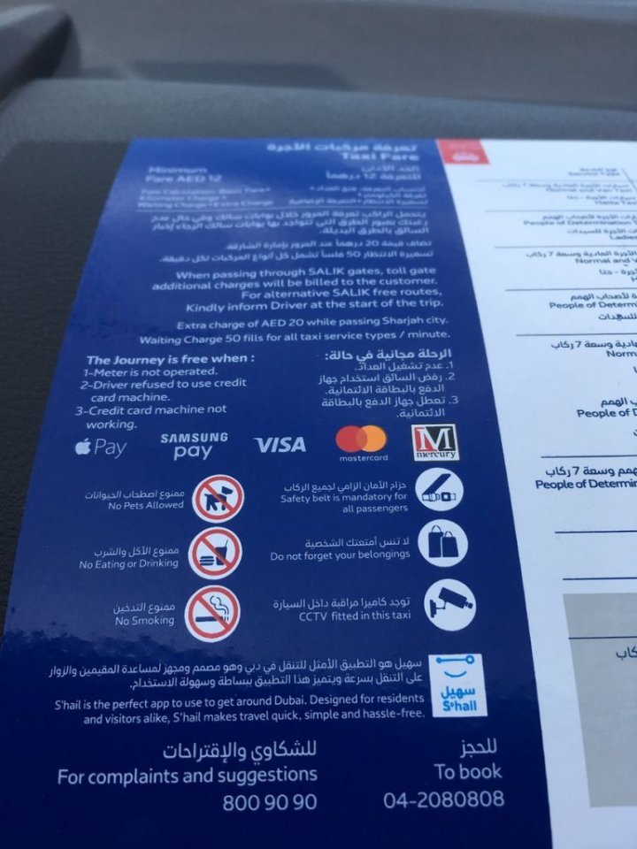 David Eiselt napsal(a):V každém dubajském taxíku, ve kterém jsem jel, byla takováto (nebo velmi podobná) nálepka, kde je napsáno, že řidič je povinen akceptovat platbu kartou. Ale cukají se dost, to připouštím.Jen pozor na to, že ne všichni berou platební kartu... Nevím proč, ale jeden jí ode mne odmítl. Naštěstí jsem měl pár drobných ještě z minulé cesty, jinak nevím co by chtěl dělat.