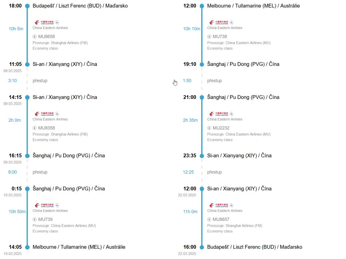 To by asi popíralo výhodu letu přes Čínu, kdyby nedokázali přeložit zavazadla. Letěli jsme jednou přes Xi'an a nic jsme řešit nemuseli. Jinak 2 přestupy v rámci 24 hodin jsou prý teoreticky možné, ale prakticky to asi může nějaký úředník nevědět/nechápat, dle ohlasů z různých fór. Osobně jsem to zkoušel jen jednou, přes Šanghaj a Xi'an do Prahy, ale to byl speciální případ v tom, že ten let do a z Xi'anu měl jedno číslo, ale teď koukám, že ten let z Budapešti to má stejně.