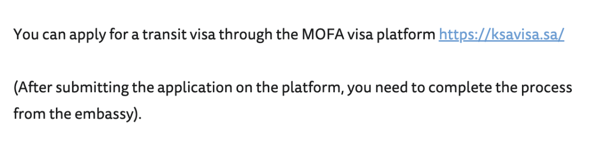 Vsetky propagacne materialy tvrdia ze k leteneke so Saudia su tranzit viza zdarma, avsak vobec to tak nie je. Cely let vratane prestupu musi by so Saudia a musi byt v ramci jednej rezervacie. Takisto to vobec nie je zdarma, stoja $25 dollarov co je rovnaka cena ako ked o ne clovek poziada na MOFA stranke individualne. Jedine comu sa clovek (mozno) vyhne je cesta na ambasadu.