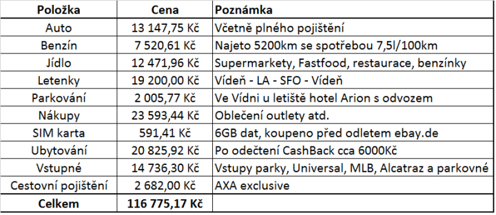 My sme poňali klasický itinerár West Coast na 17 nocí trochu luxusnejšie (požičali sme si Teslu 3 - to samo o sebe stálo cca 1500€), hotely na úrovni 4* v mestách (Sheraton, Marriott, Trump International, Westin...) a mimo miest vyššia trieda 3* motelov (Hilton Garden Inn, Hampon Inn atď.) a celkom veľa sme minuli na jedle (vpodstate len reštaurácie, minimum fast foodu a jedla zo supermarketov) a hlavne pive :) a aj tak sme sa vliezli s kompletnými nákladmi do 2000€ / 50k Kč na osobu (boli sme 4). Letenky z Viedne s Virgin s odbavenou batožinou za cca 320€.