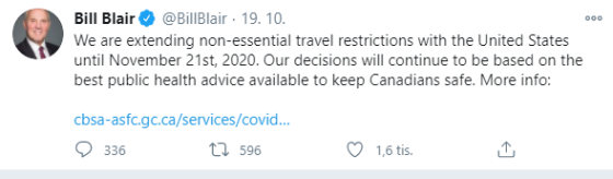 We are extending non-essential travel restrictions with the United States until November 21st, 2020.