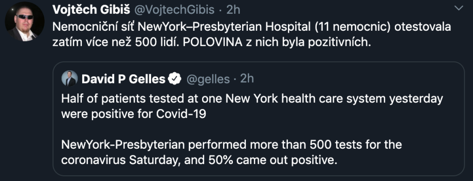 Jinak pro představu, jak se to rozjíždí v USA: "Nemocniční síť NewYork–Presbyterian Hospital (11 nemocnic) otestovala zatím více než 500 lidí. POLOVINA z nich byla pozitivních."
