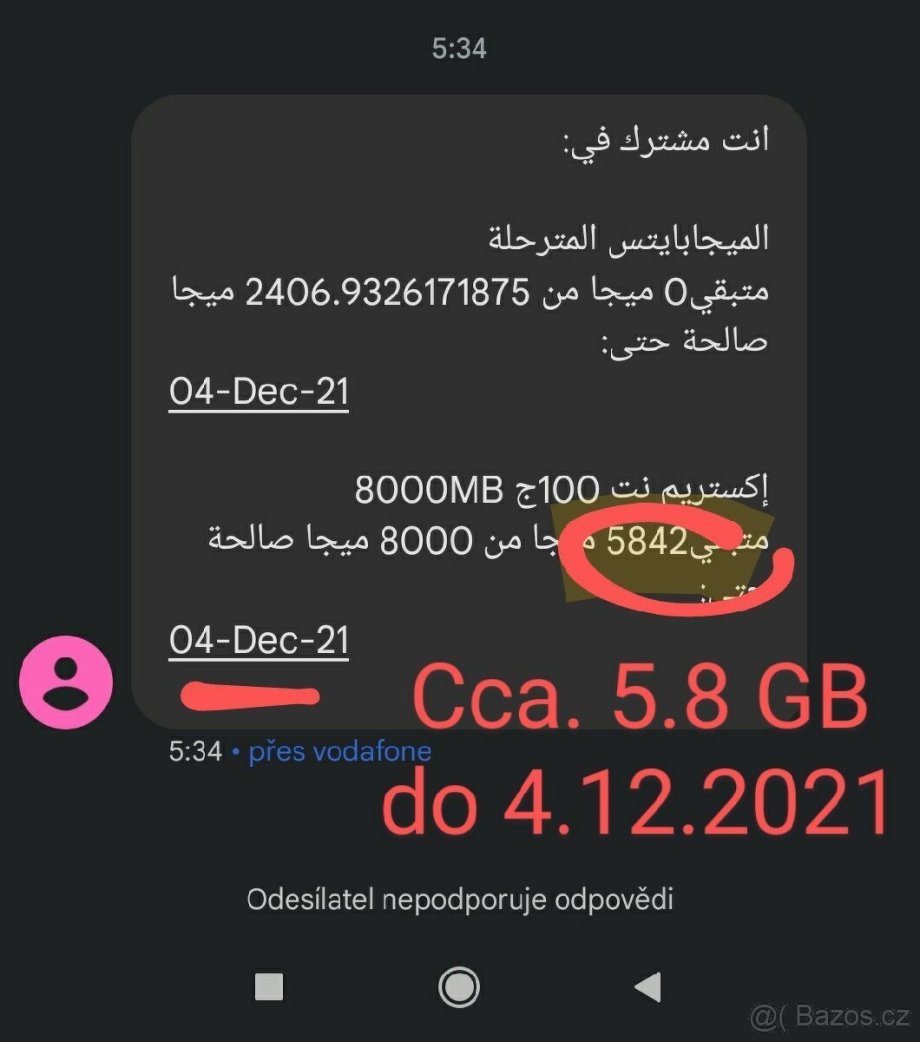 prodám egyptskou sim kartu Vodafone s 5,8GB dat s platností do 4.12.2021