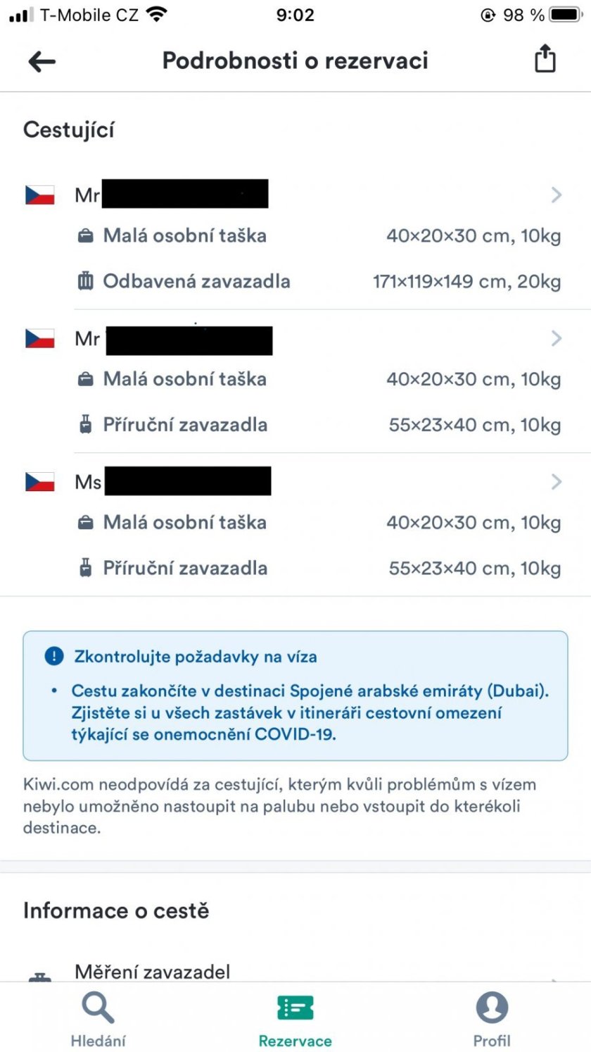 Přenechám letenky Katowice-Dubaj: Přenechám 3 letenky z Katowic do Dubaje. Termín 7.2.2022-14.2.2022. K tomu přikoupeny 2 příruční zavazadla a jedno odbavené do 20kg. Letenky jsou pro 2 dospělé osoby a jedno dítě (10 let), včetně pojištění. Zakoupeno na kiwi.com, teď ve fázi rezervace, letenky ještě nejsou vydány. Po prodeji bych změnil iniciály a letenky předal. Cena koupených letenek byla 26.000,- a přenechám za 20.000,-.