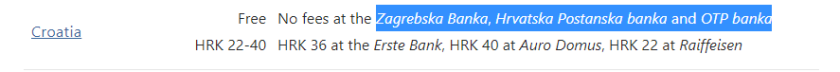 tak základ asi dobrý ale jen 3 komentáře a článek z 20.7.2019 a u Chorvatska třeba vím, že Zágrebačka a OZP si účtují poplatek 35 HRK, viz, má galerie https://photos.app.goo.gl/QH42X9EFapt46NcB8 nutno tedy dodat, že asi ne všude, protože na Pagu ano a od lidí, kteří vybírali v Záhřebu ze stejných bankomatů vím, že jim to poplatek neúčtovalo.. no je v tom fakt bordel.. :(