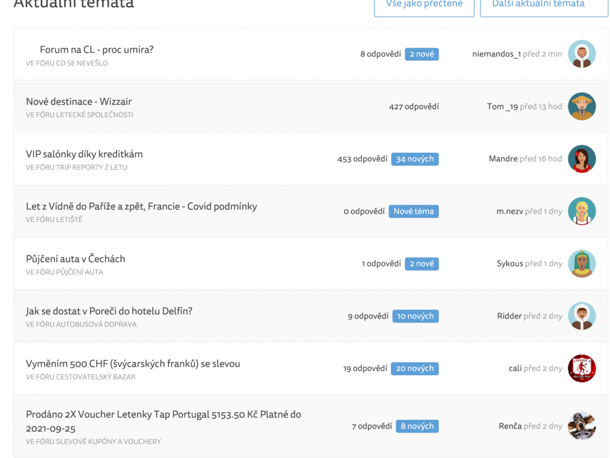 My two cents: Jiz delsi dobu jsem mel nutkani zalozit toto jiste kontroverzni tema. Osobne mam pocit, ze ve srovnani se stavem pred nekolika lety je zde v diskuznim foru mnohonasobne mene prispevku za den. Coz v mnoha pripadech neni na skodu veci, ale je celkem divny stav, ze nekdo polozi relativne jednoduchy dotaz (covid restikce pri cestovani viden-pariz), ktery by zustal den bez jedine odpovedi. Mozna jen lide proste maji plne bryle covidu (ockovani, rousky, certifikaty, restrikce, testovani, vaxeri vs. antivaxeri). Co me stvalo/stve a proc jsem vicemene toto forum opustil 1. Mikir. Vyrazne se situace zlepsila moznosti skryti jeho bludu a zvastu 2. Nekonecne litanie ohledne covidu. Opravdu nekdo cestoval na zaklade informaci nacerpanych na ceskem diskuznim foru? Neoveroval na MZV CR a na strankach ministersta vnitra transitni a konecne destinace? 3. Odchod/utlumeni aktivity lidi, kteri meli nacestovano a meli co rict. Alespon z meho pohledu. eremi, petr76, miro776, lukasAK, niemandos mezi mnoha dalsimi 4. Pristihnul jsem se, ze uz tu verejne lidi posilam do prdele, coz nemel vubec nikdo zapotrebi a omlouvam se vsem za to. 5. Nezakladaji se nova vlakna, ktera by mne osobne neco noveho davala. dtto nove prispevky ke stavajicim vlaknum. Asi jsem jen moc stary a moc zkuseny. Mam tak nejak na haku letenky nekam po Evrope s LCC a batuzkem za 20EUR nebo za par tisicovek se Scootem do Singapuru Zaroven chapu, ze prave takove letenky dokazi oslovit asi velkou cast lidi v teto skupine. Zajimam se spise o loyalty programy, mileage runy a byznys letenky - a opet je mi naprosto jasne, ze na to jsou urcena jina fora. 6. Flame ktery zde spusti uverejneni solidniho LM dealu i treba s All inclusive. Opravdu sem nechodi jen lide co za 3500Kc sakumprdum zvladnou tydenni pobyt kdekoliv zorganizovany na vlastni pest. Cestuj levne je i me heslo, ale rozhodne ne za kazdou cenu - kazdy mame komfort sveho cestovani nastaveny jinak. 7. Absence moderovanych diskuzi. Sedlo si to casem, kdy prakticky neni co moderovat. EDIT:8.spamove prispevky, ktere zustavaji az nezdrave dlouho na tapete. EDIT2: kudos to admin - posledni 2 spamy zmizely do minuty. Proc se vracim: 1.cestopisy - nyni z meho pohledu nejhodnotnejsi cast CL. Je to o vybirani ruzi mezi trnim a ano, vadi mne kratke cestopisy s linkem/proklikem na pokracovani cestopisu na strankach autora, ale proste kazdy se snazi nejak nahnat pristupy. 2.zvedavost, jestli se nevyloupla nejaka super akce 3.podelit se o pripadnou super akci z jinych for      .