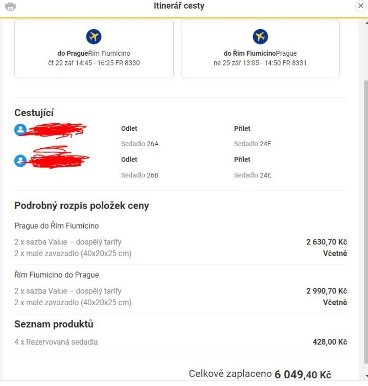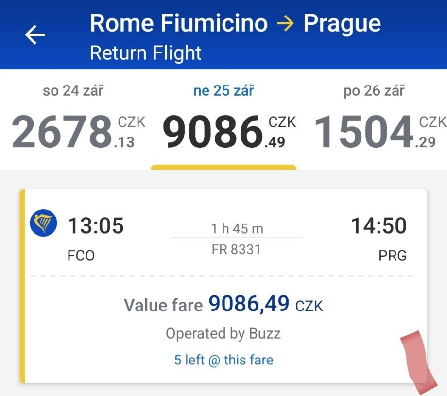 Prodám dvě letenky společnosti Ryanair do Říma v termínu 22.-25.9. Jméno lze změnit až dvě hodiny před odletem. Původní cena 6 049,- za obě letenky, a nyní je cena letenek přes 22 tis. Nechám za 4 500,-, při rychlém jednání sleva.