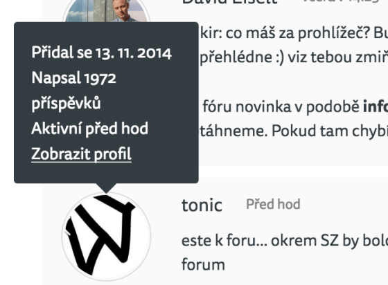 Ve fóru novinka v podobě informace o uživateli při přejezdu myší přes avatar. Nevypadá to světoborně, grafiku dotáhneme. Pokud tam chybí nějaké základní info, dejte vědět. Soukromé zprávy tam přibudou.