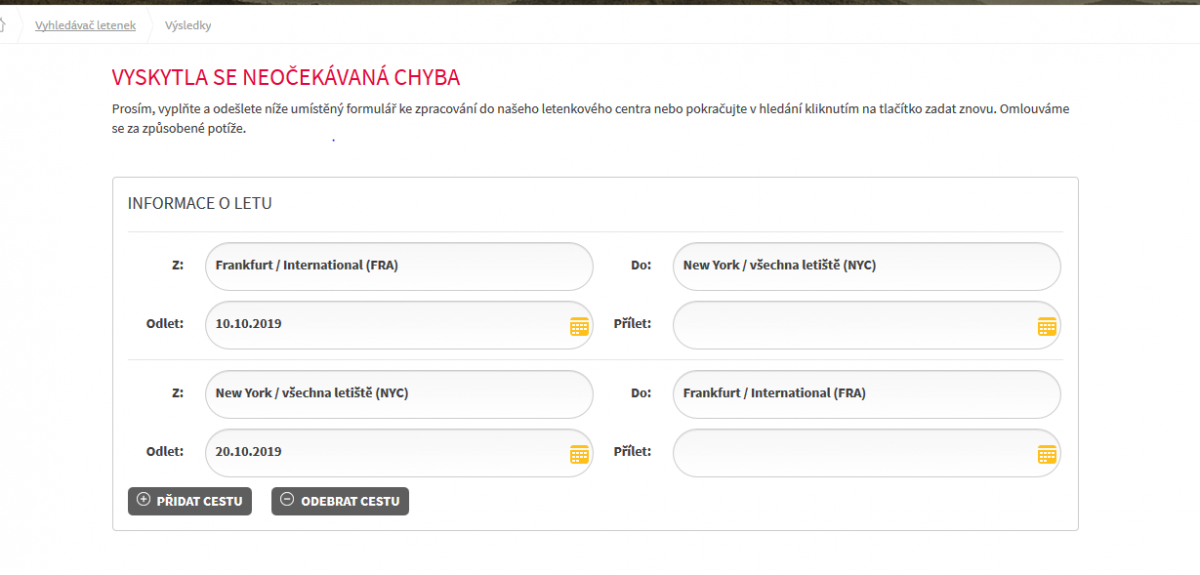 Já mam problém s vyhledáváním letenek do USA. Když si chci zadat odbavené zavazadlo v ceně letenky, tak mi to vyhodí chybovou hlášku.