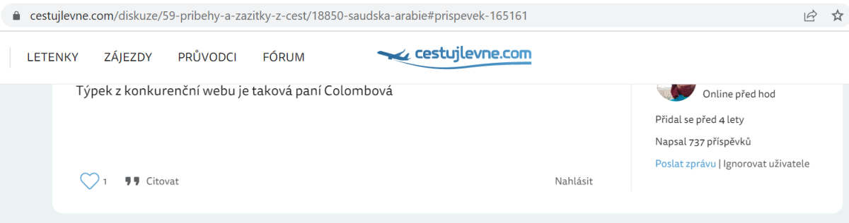 divan před 3 lety (28. 11. 2022 14:40) Online před hod Přidal se před 6 lety Napsal 1098 příspěvků Poslat zprávu Zobrazit příspěvek Anebo obnovit předchozí funkčnost - když se z hlavní stránky klikne u cestopisu na X komentářů, tak jít rovnou na komentáře u tohoto cestopisu a ne na začátek cestopisu.