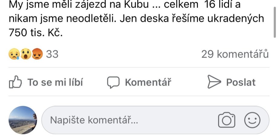 No, tak to je slusny 😀 nejaka pani prodavala zajezdy, dost jich prodala v jedne skupine na FB, vybrala prachy a tedka si uziva na Jamajce 😄