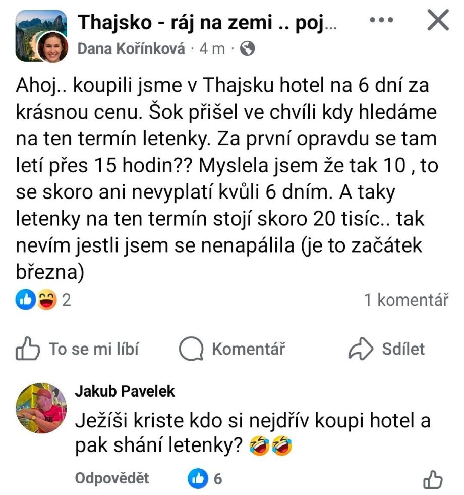 Zdravim vospolok. Dnes som uporne v praci rozmyslal, ci mam zalozit tuto temu. Predsa, nikto uceny z neba nespadol (alebo ziadna otazka nie je hlupa), ale to co v "cestovatelskych" skupinach na FB sa clovek docita...rozum zostava stat. Uz je nam tak dobre, ze aj Vysoka skola zivota (prip. studied at Harvard, alebo manager at Durex) moze cestovat dalej ako na pivo, takze som sa rozhodol, ze tu sem tam prispejem nejakym peknym screenshotom. Dufam, ze nikoho neurazim tuto z pritomnych a prilis si nepokazim moj biedny image :D Samozrejme vsetky mena cenzurovane. Zaciname klasickou otazkou ohladom batoziny v Ryanair...ktora sa necakane zvrtla (aj bez koleciek) :D .
