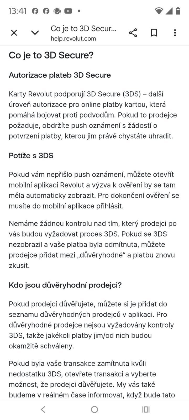 Někdy jde zaplatit kartou online bez potvrzení, ale běžně je potvrzení vyžadováno viz příloha. To samé platí i o dalších kartách, kde taky musíš opsat kód ze SMS (pokud nejde o malé částky), která přijde na mobil. Ztráta karty problém není, když jich máš víc, ale ztráta či krádež mobilu ano, a to u Revolutu podobně jako u jiných karet. U Wise by dočasně šlo platit online s verifikací plateb na druhém mobilu do doby, než budou chtít potvrdit na primárním mobilu (za předpokladu dvou mobilů a oba s funkční aplikací).