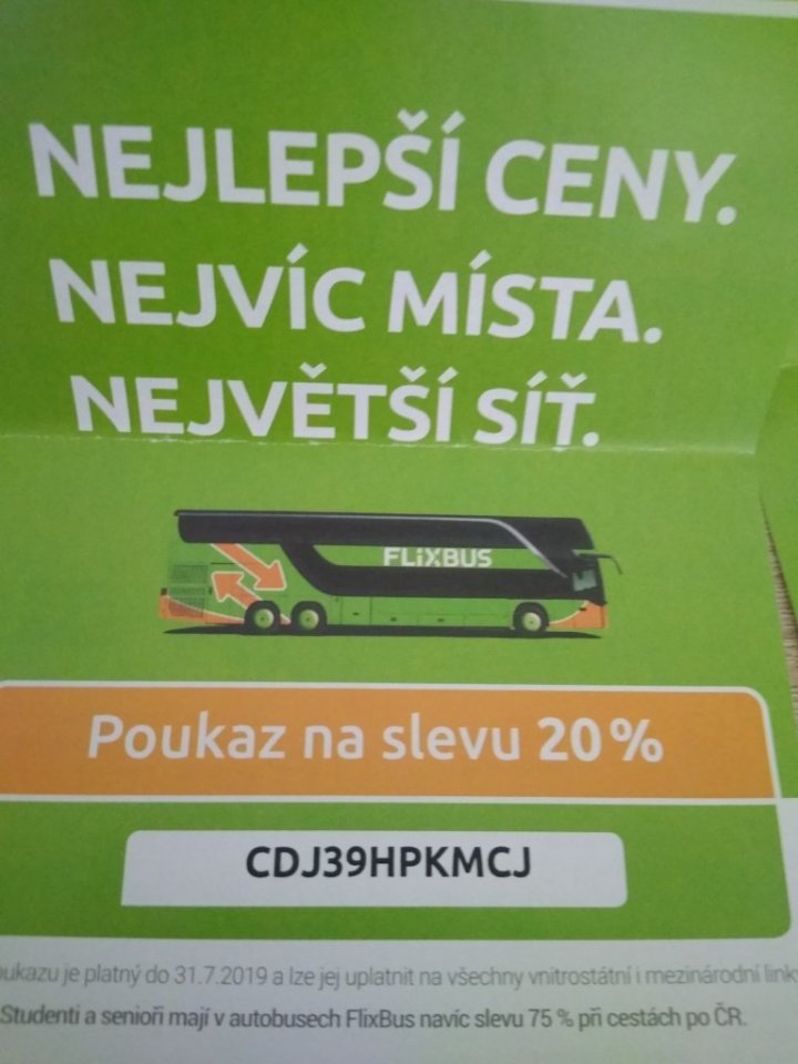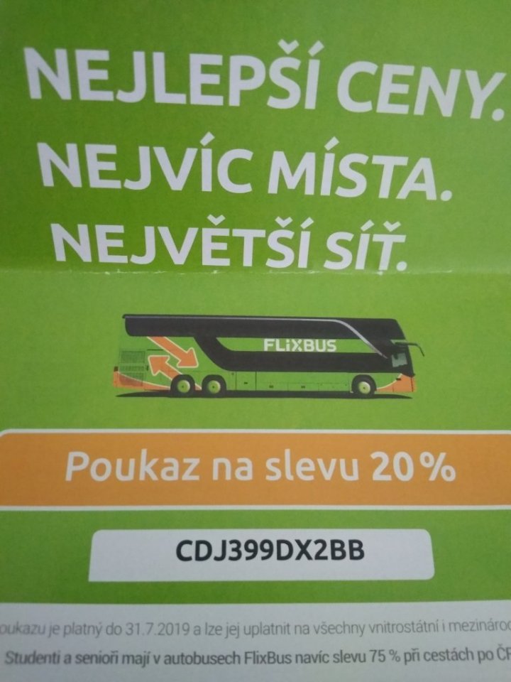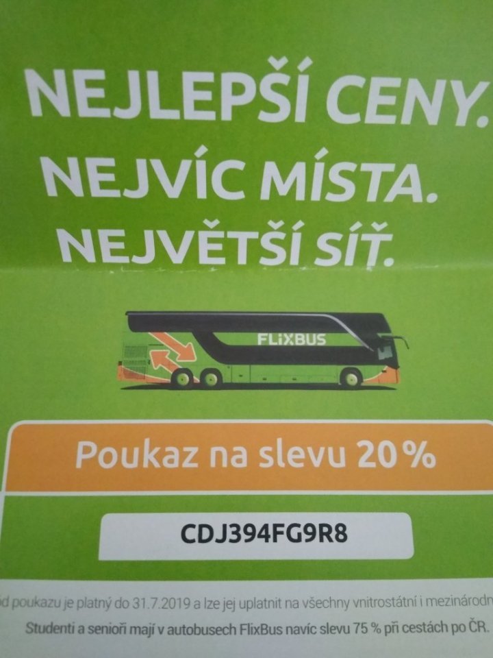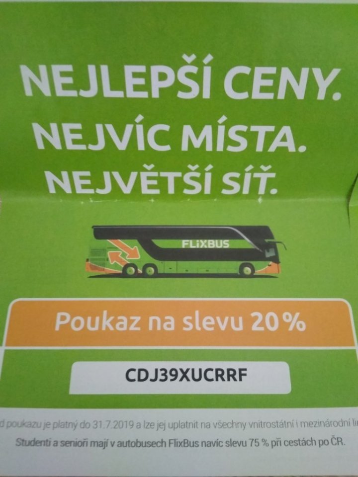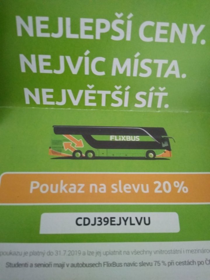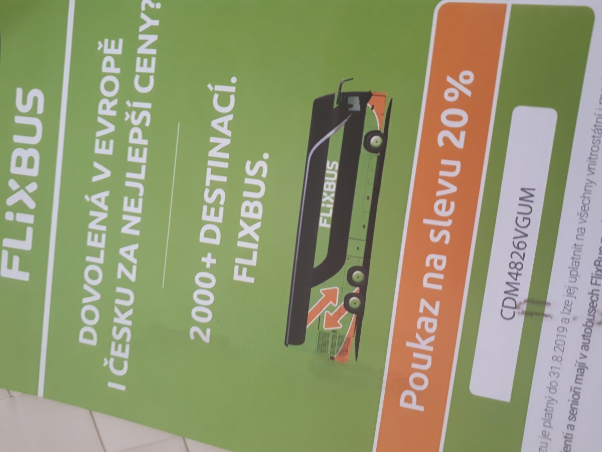 Ahoj,nabízím několik voucherů na 30 % slevu na Flixbus. Vouchery jsou platné do 15. 12. 2017. Jízdenky mohou být zakoupené na jakékoliv datum. Platí i na mezinárodní jízdenky. Sleva je na celý košík, je tedy možné jeden voucher uplatnit i na více jízdenek na různých trasách a různé cestující, viz printscreen. Prodám 1 ks za 50 Kč.V případě zájmu, pište na mail: tereza.korychova@seznam.cz .