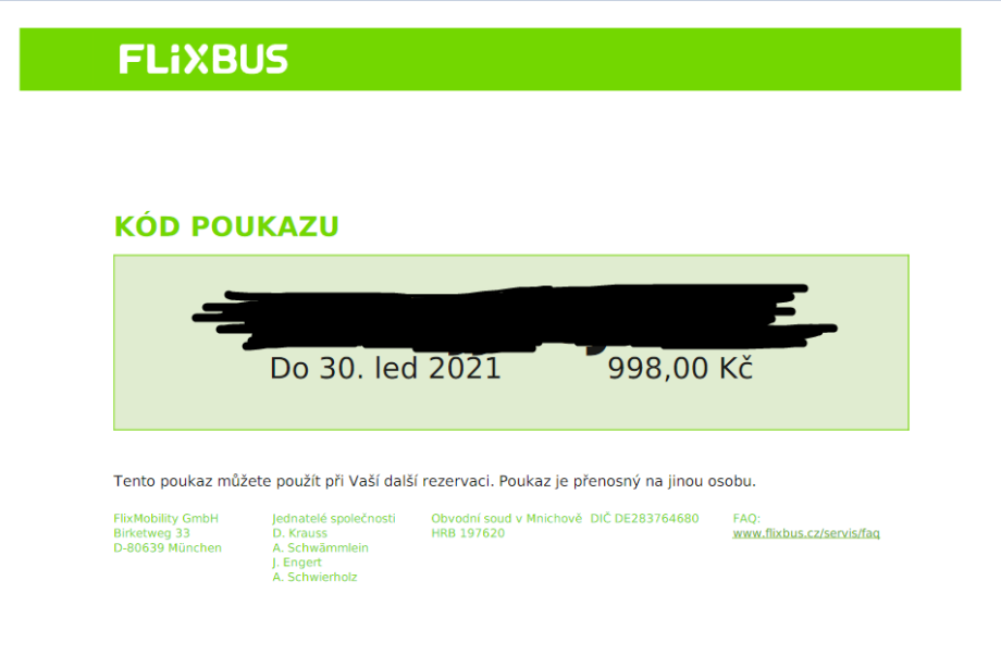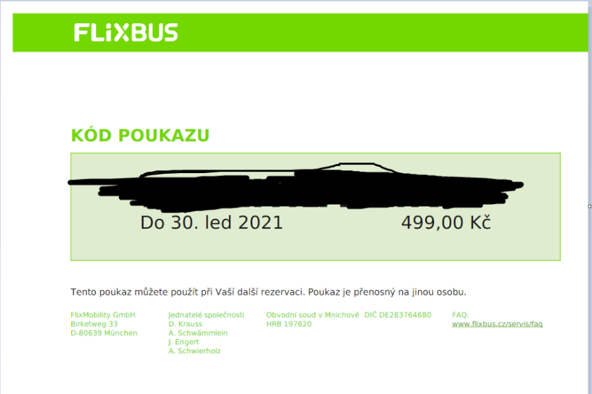 Nabízím 2 vouchery na Flixbus. Návratek za strorno cesty. Lze použít jako platidlo zadáním kódu při platbě. Hodnota 998 a 499 Kč. Oba přenechám za 1000. Platnost voucherů je do 30.1.2021.