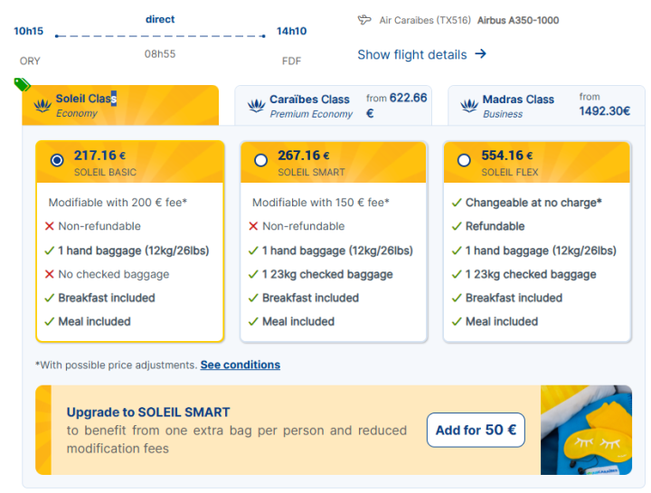 V dálkových letadlech Airbus A330 a Airbus A350 je k dispozici ekonomická (Soleil), prémiová ekonomická (Caraïbes Class) a business třída (Madras Class).
